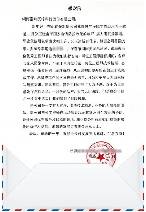 感謝他們舍棄春節(jié)與家人團(tuán)聚時(shí)光新年伊始,泰瑞收到了這封來(lái)自新疆的感謝信。