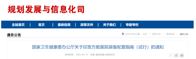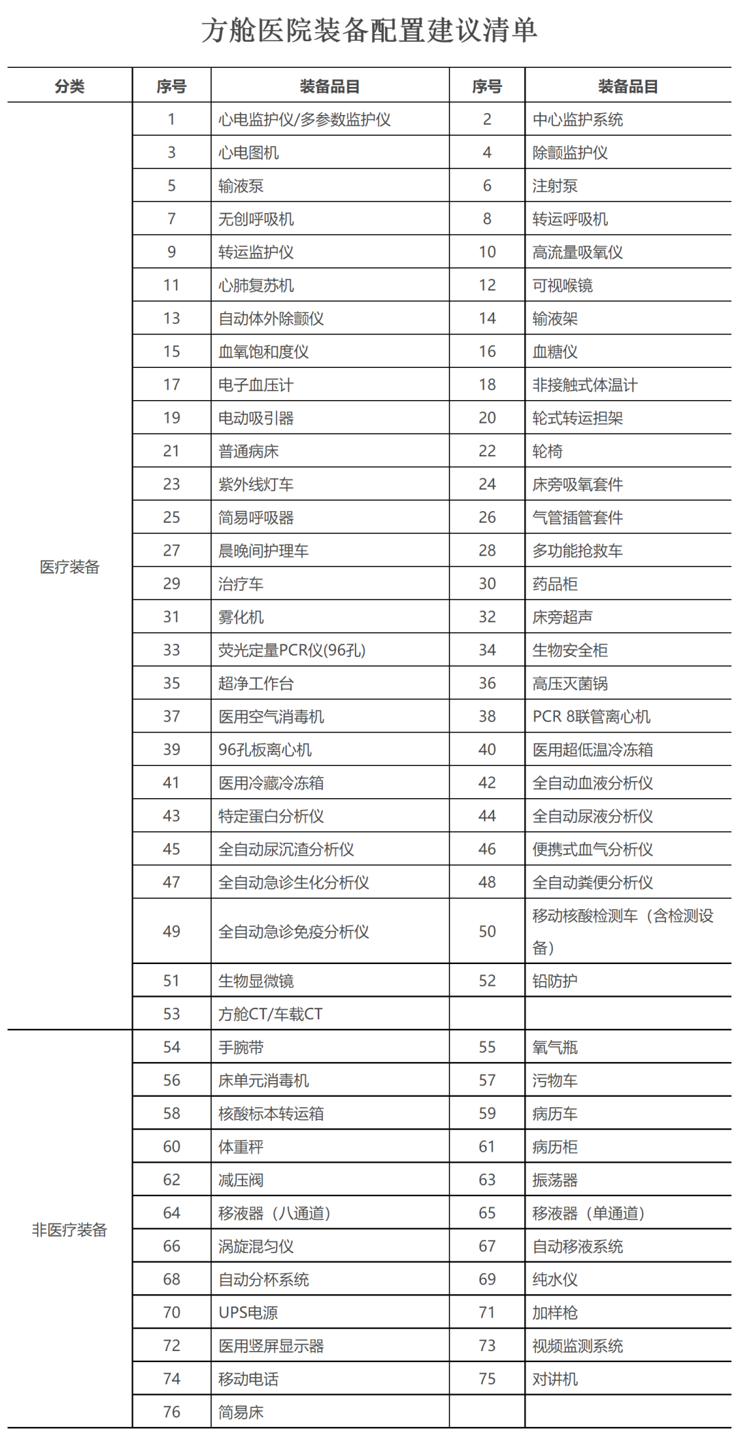 7月13日,國(guó)家衛(wèi)生健康委辦公廳發(fā)布《關(guān)于印發(fā)方艙醫(yī)院裝備配置指南(試行)的通知》,明確方艙醫(yī)院裝備配置建議清單(附文末)。