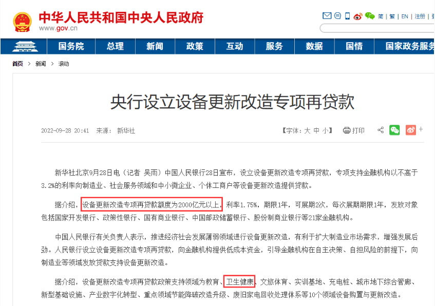 2022年9月,國務(wù)院常務(wù)會議決定以專項(xiàng)再貸款與財(cái)政貼息的方式,設(shè)立額度為2000億元以上設(shè)備更新改造專項(xiàng)再貸款,衛(wèi)生健康為該政策重點(diǎn)支持領(lǐng)域之一。國家衛(wèi)健委隨即發(fā)布通知,將使用財(cái)政貼息貸款更新改造醫(yī)療設(shè)備,對醫(yī)療設(shè)備領(lǐng)域超千億的資金支持。