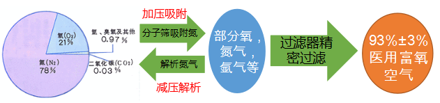 PSA制氧,是以分子篩為吸附劑,通過變壓吸附法(PSA),以環(huán)境空氣為原料,在常溫低壓的條件下,利用分子篩加壓時對空氣中的氮氣(吸附質(zhì))吸附容量增加,減壓時對空氣中的氮氣吸附容量減少的特性,形成加壓吸附、減壓解吸的快速循環(huán)過程,使空氣中的氧和氮氣得以分離,而空氣中的二氧化碳、氣態(tài)酸和其它氣態(tài)氧化物等,均屬于分子極性很強的物質(zhì),很難通過分子篩,從而使產(chǎn)出氧的氧氣純度達到93% ±3%v/v以上。